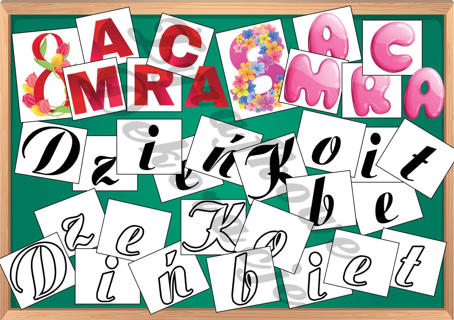 • Napis Dzień Kobiet (w dwóch wersjach: czarny oraz tylko z obrysem, do wydruku na kolorowej kartce),