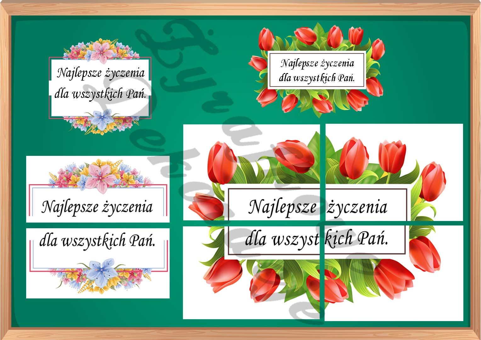 • Życzenia dla Pań (w dwóch wersjach kolorystycznych).