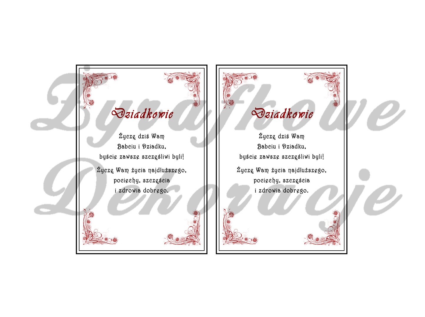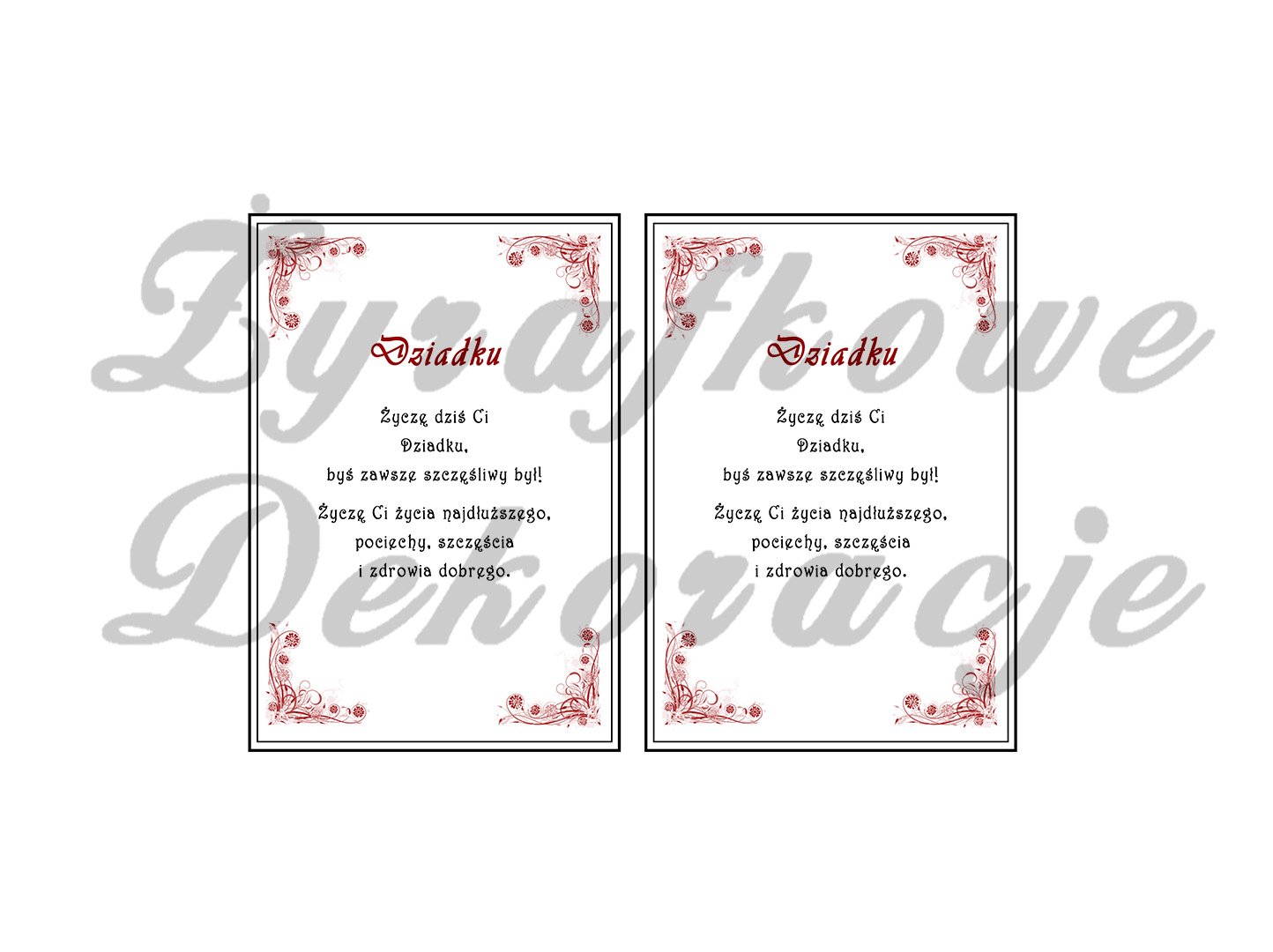 Po zaksięgowaniu wpłaty przesyłamy plik PDF z kartką z życzeniami do samodzielnego wydruku. W pliku znajdują się życzenia dla: babci, dziadka, dziadków.