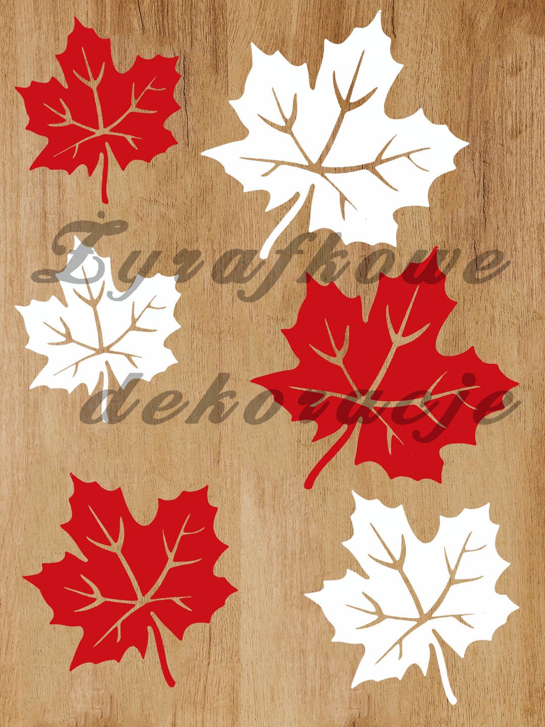 Dekoracja wycięta w papierze o gramaturze 160g (brystol). Zestaw składa się z 20 klonowych liści w wymiarach 8-12 cm.