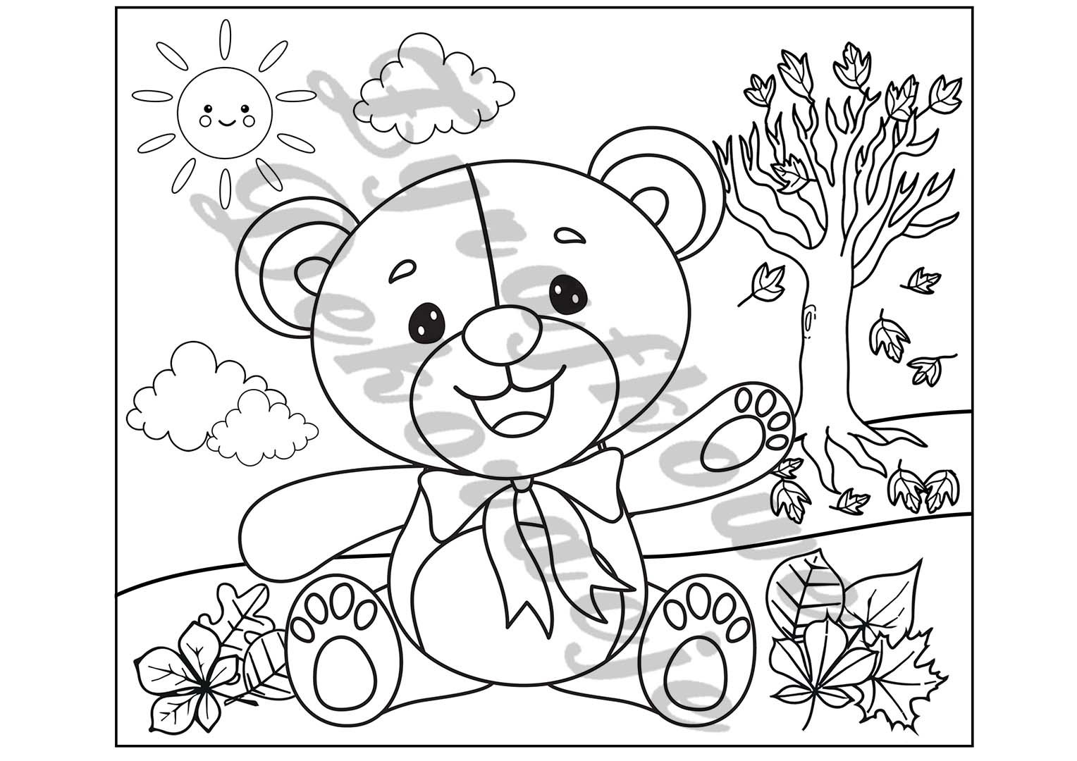Plik PDF składa się z dwóch wersji kolorowanek: pluszowy miś oraz pluszowy miś z jesiennym krajobrazem.